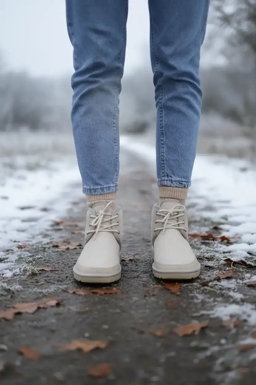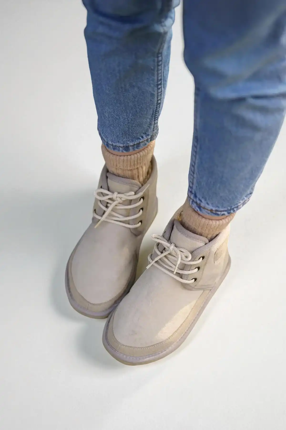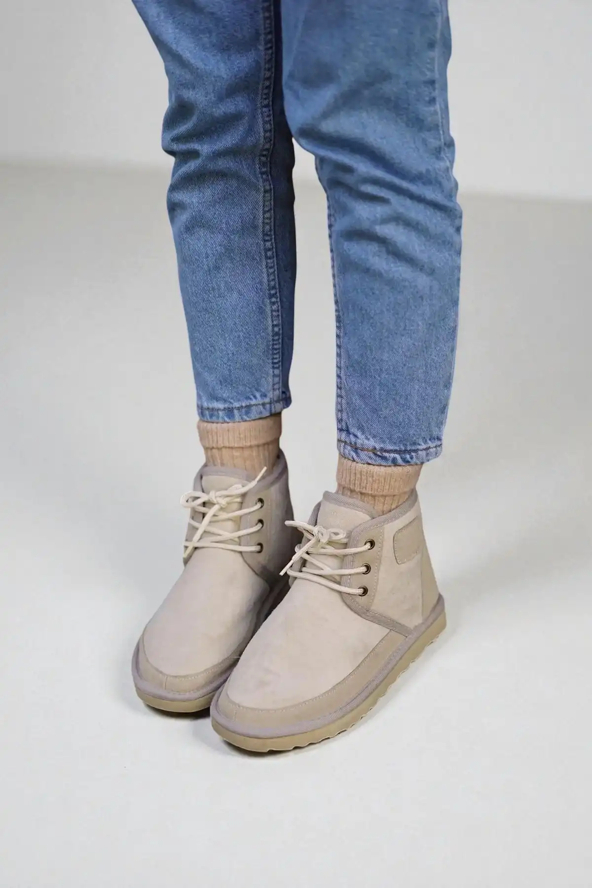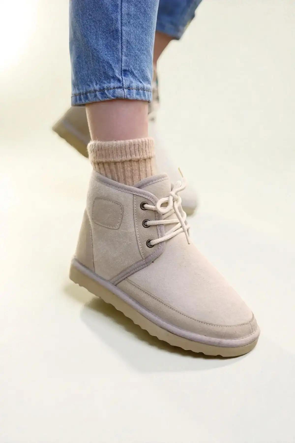 Bu şık ve şık bağcıklı süet tüylü kadın bot, gardırobunuza zarif bir dokunuş katacak.