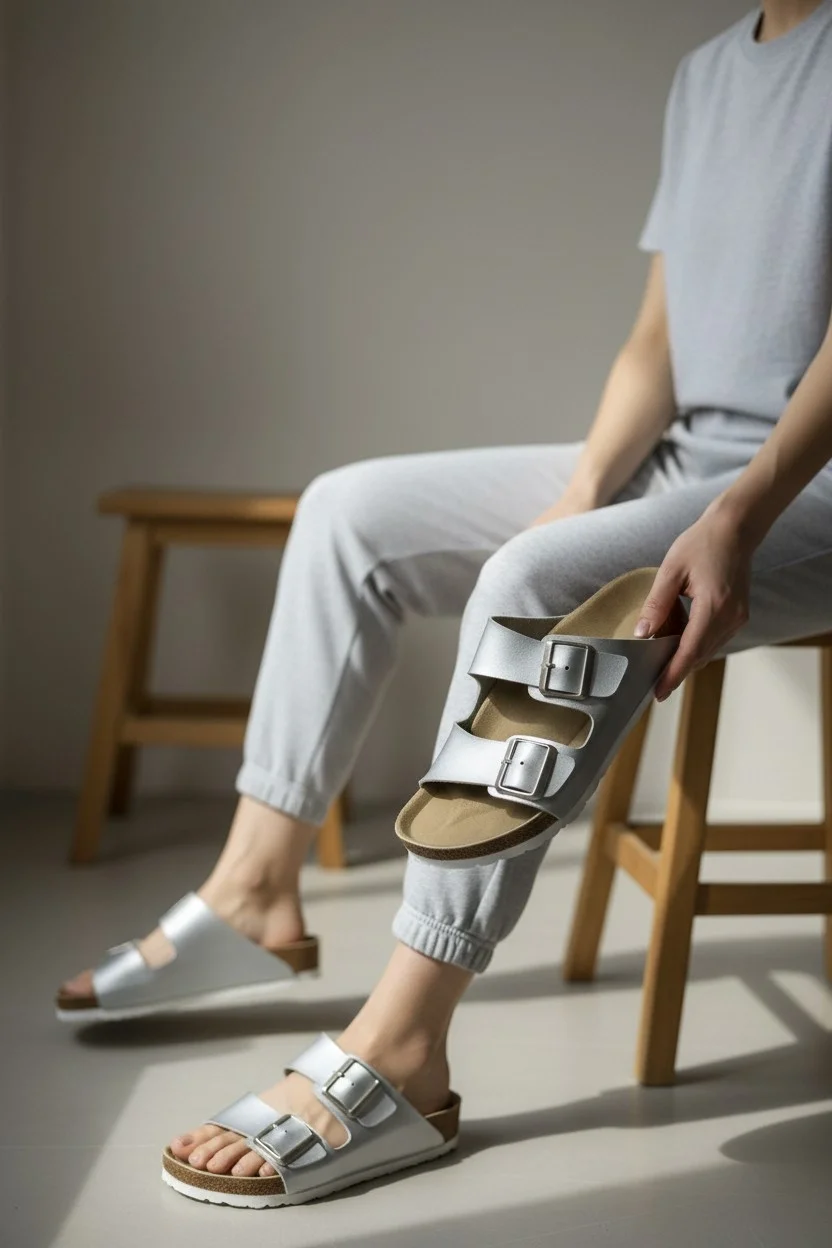Şıklığı ve konforu bir arada sunan Kadın Gümüş Çift Tokalı Terlik ile yaz aylarında tarzınızı konuşturun. Ortopedik tabanı sayesinde ayak sağlığınızı korurken, şık tasarımıyla da her adımda öne çıkmanızı sağlar.