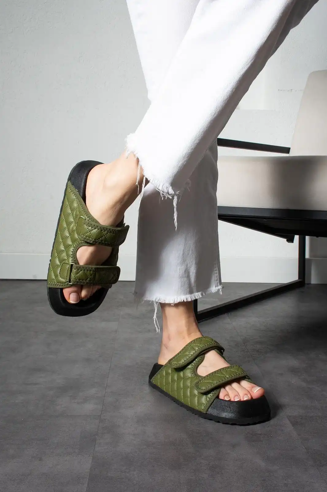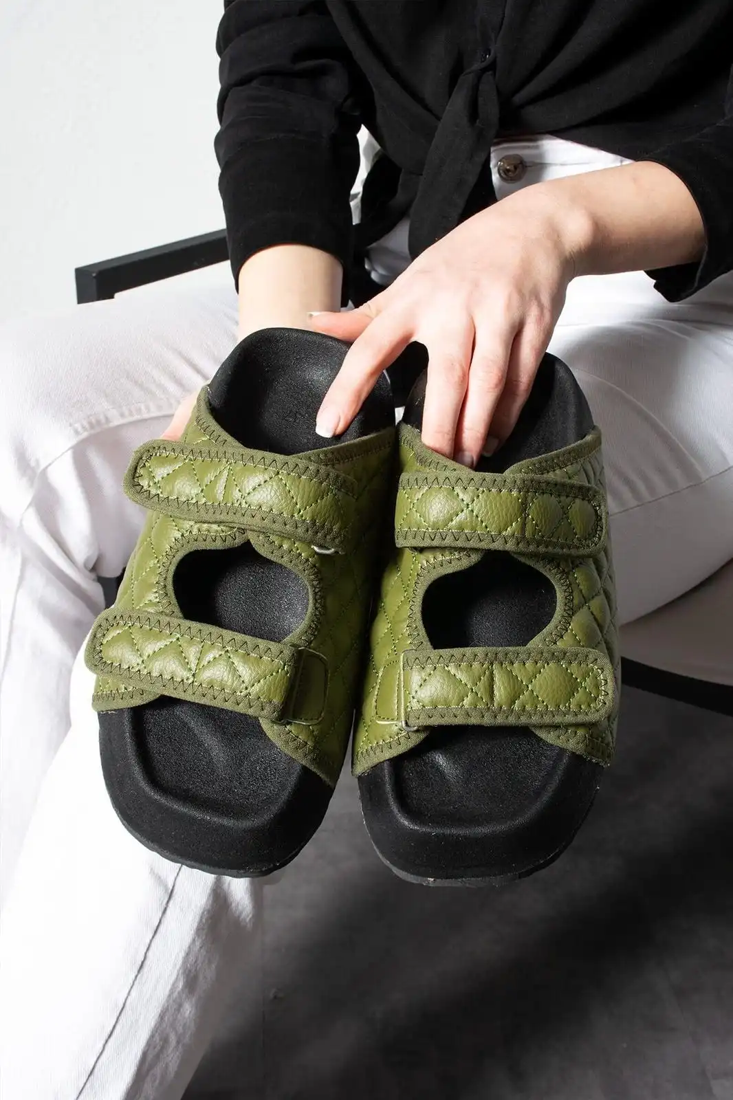 Şıklık ve rahatlık arayan kadınlar için ideal bir terlik: Kapitone Cırtcırtlı Kadın Terlik Haki!