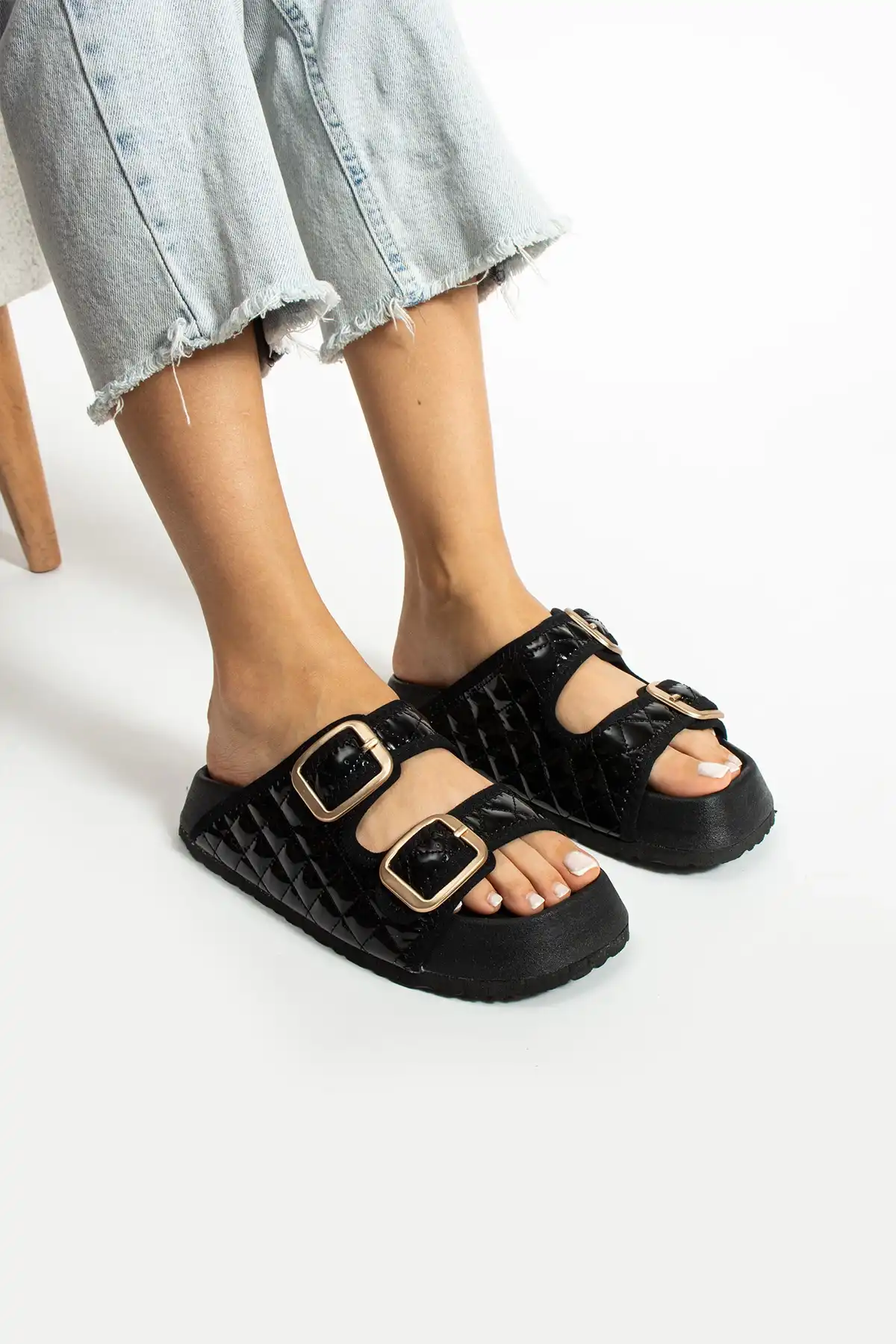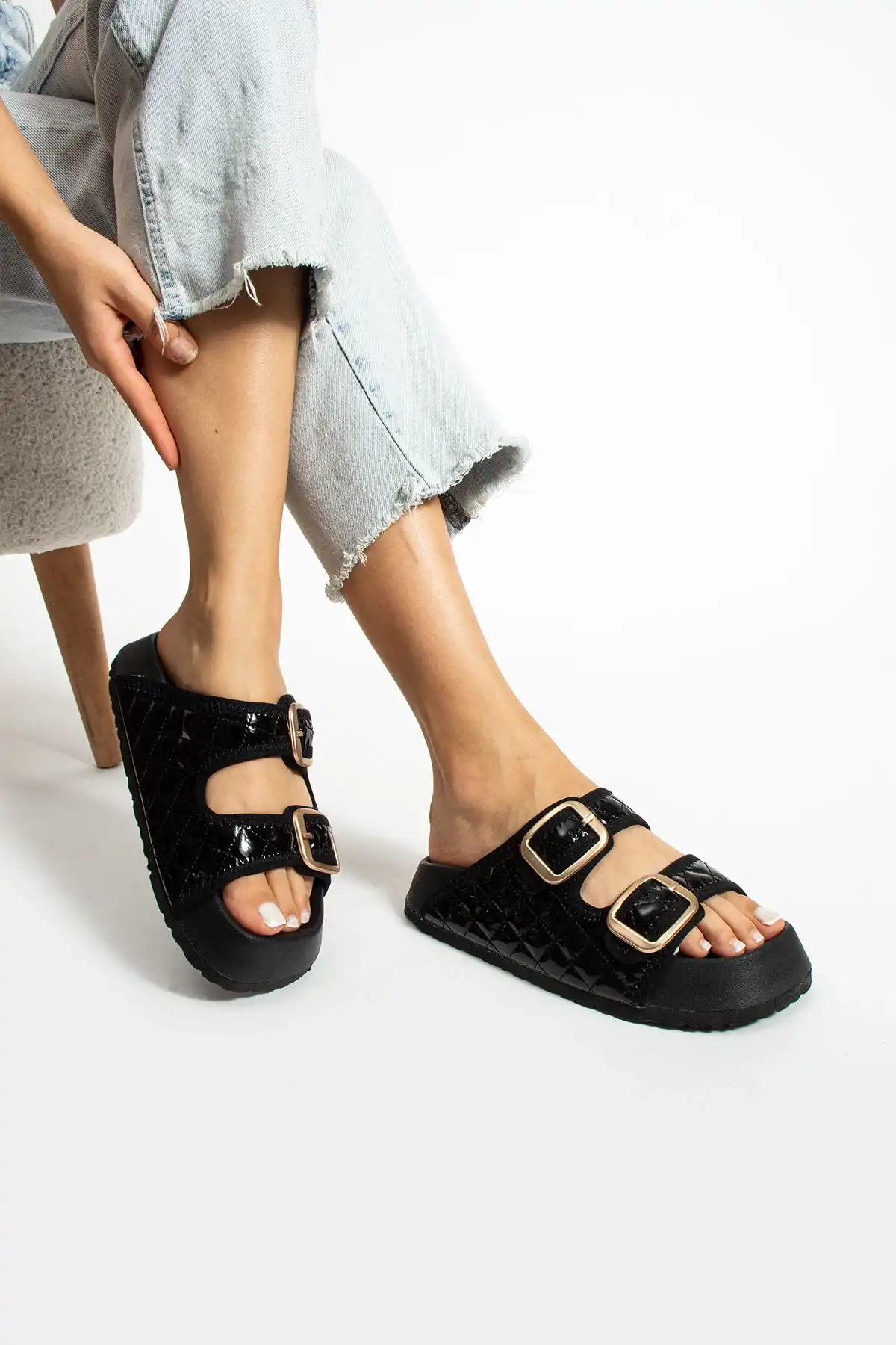 Parlak siyah tokalı kadın terlik, hem şık tasarımı hem de sağladığı konfor ile adeta bir şıklık ve rahatlık ikonu!