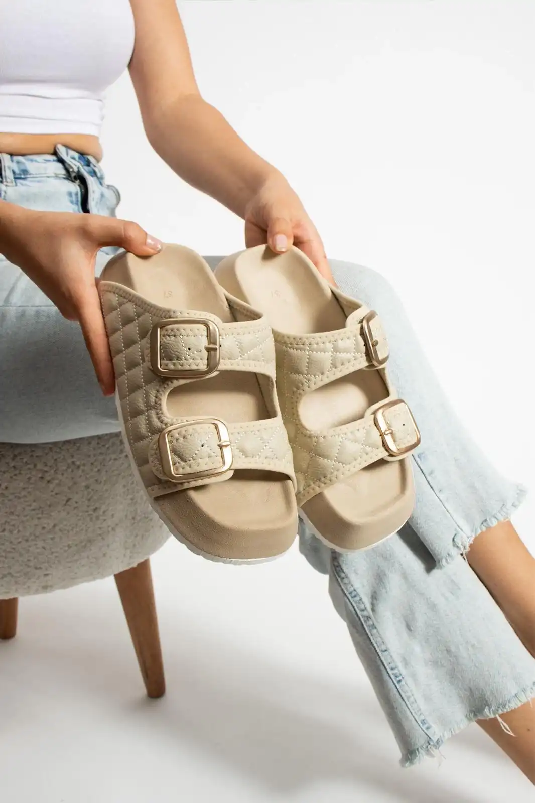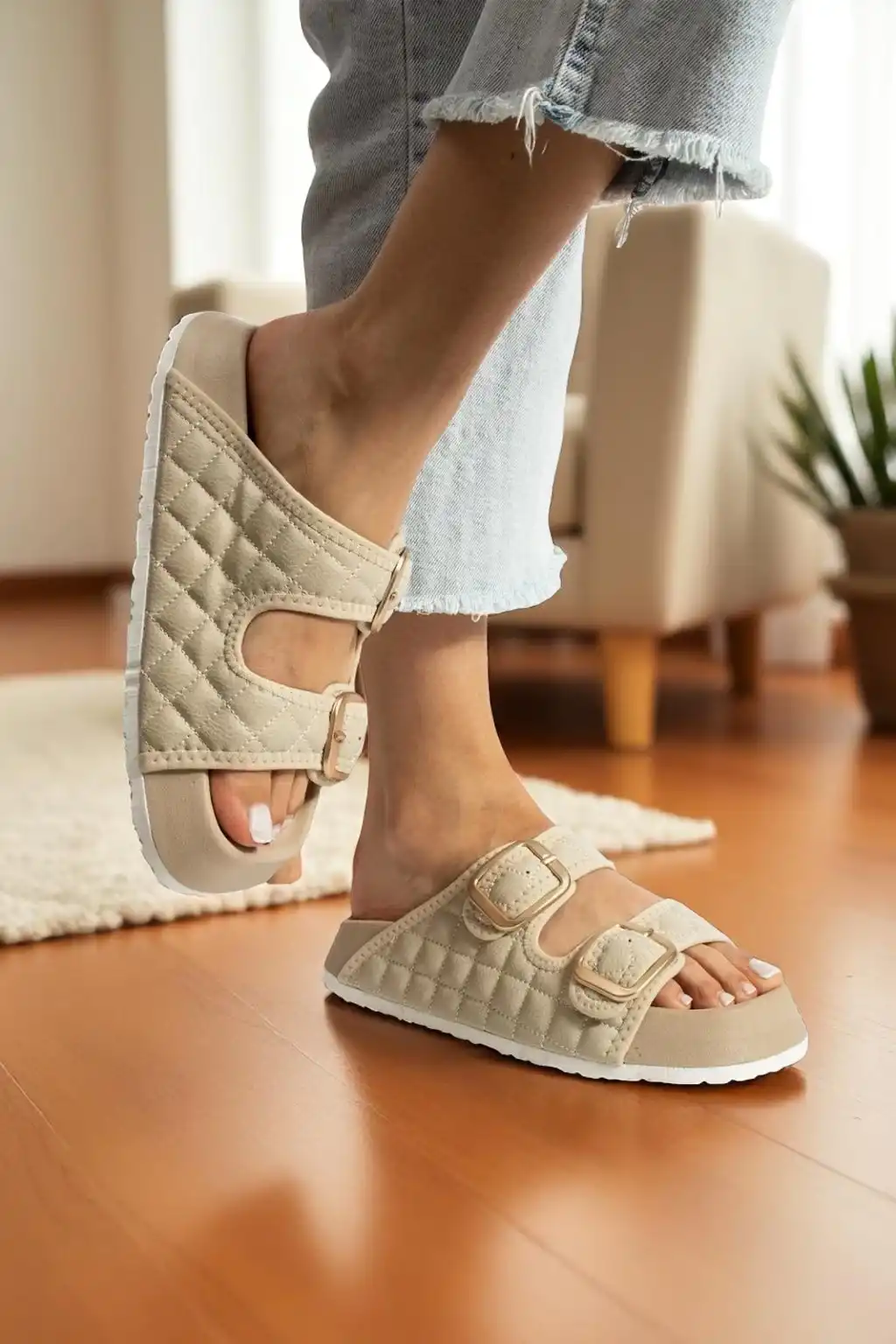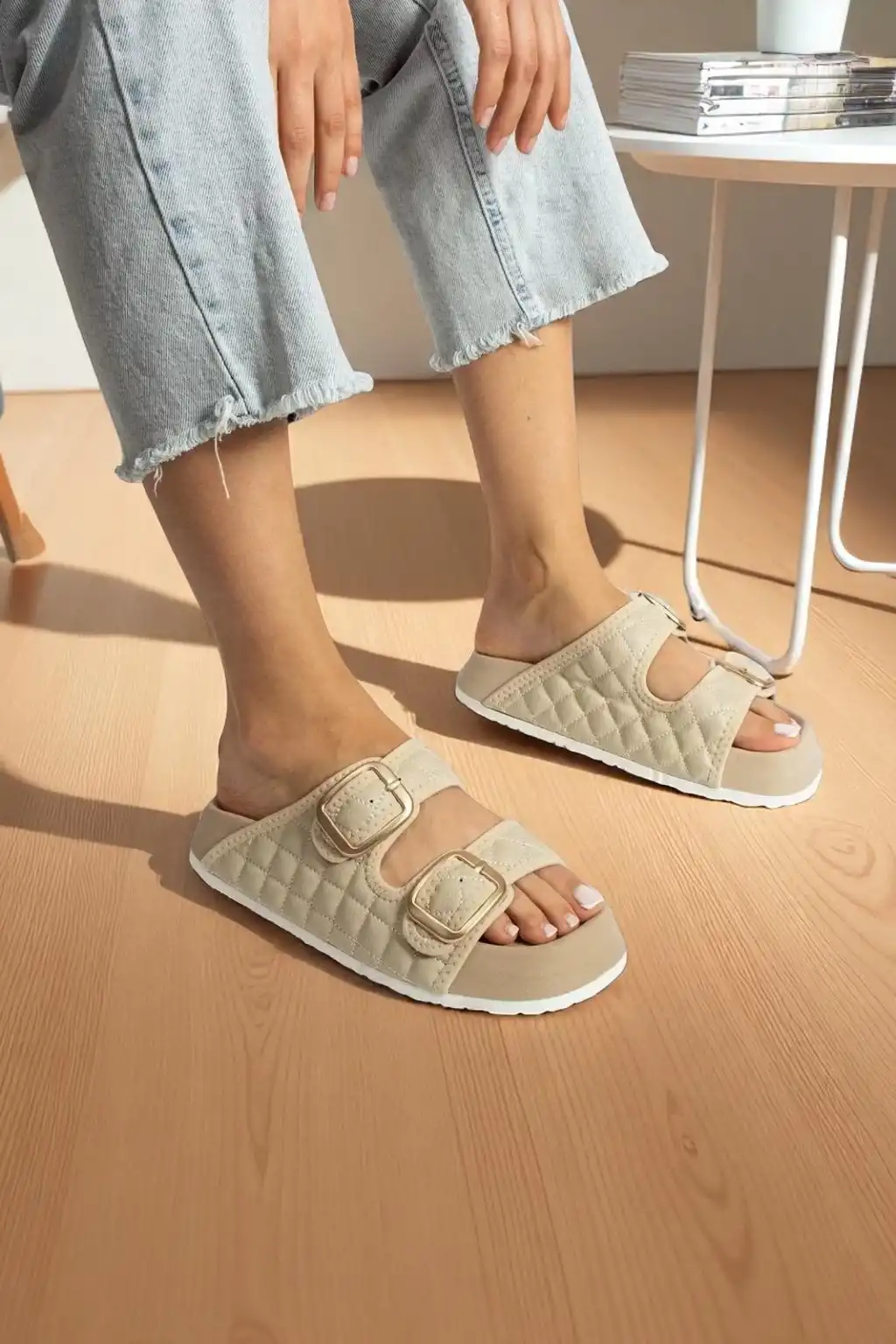Şıklık ve rahatlık arayan kadınların vazgeçilmezi olan Kapitone Tokalı Kadın Terlik Bej, özel tasarımıyla fark yaratıyor.