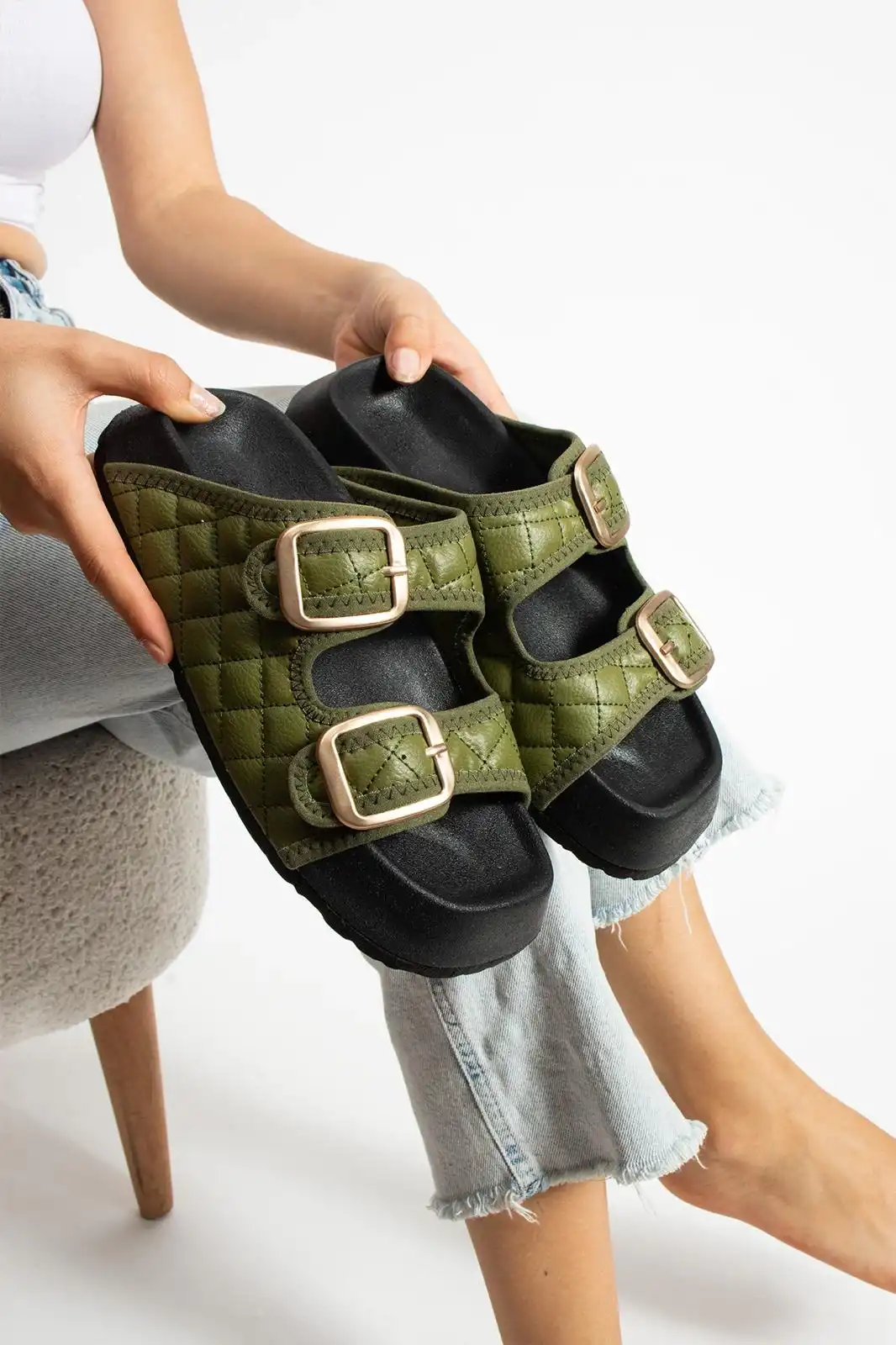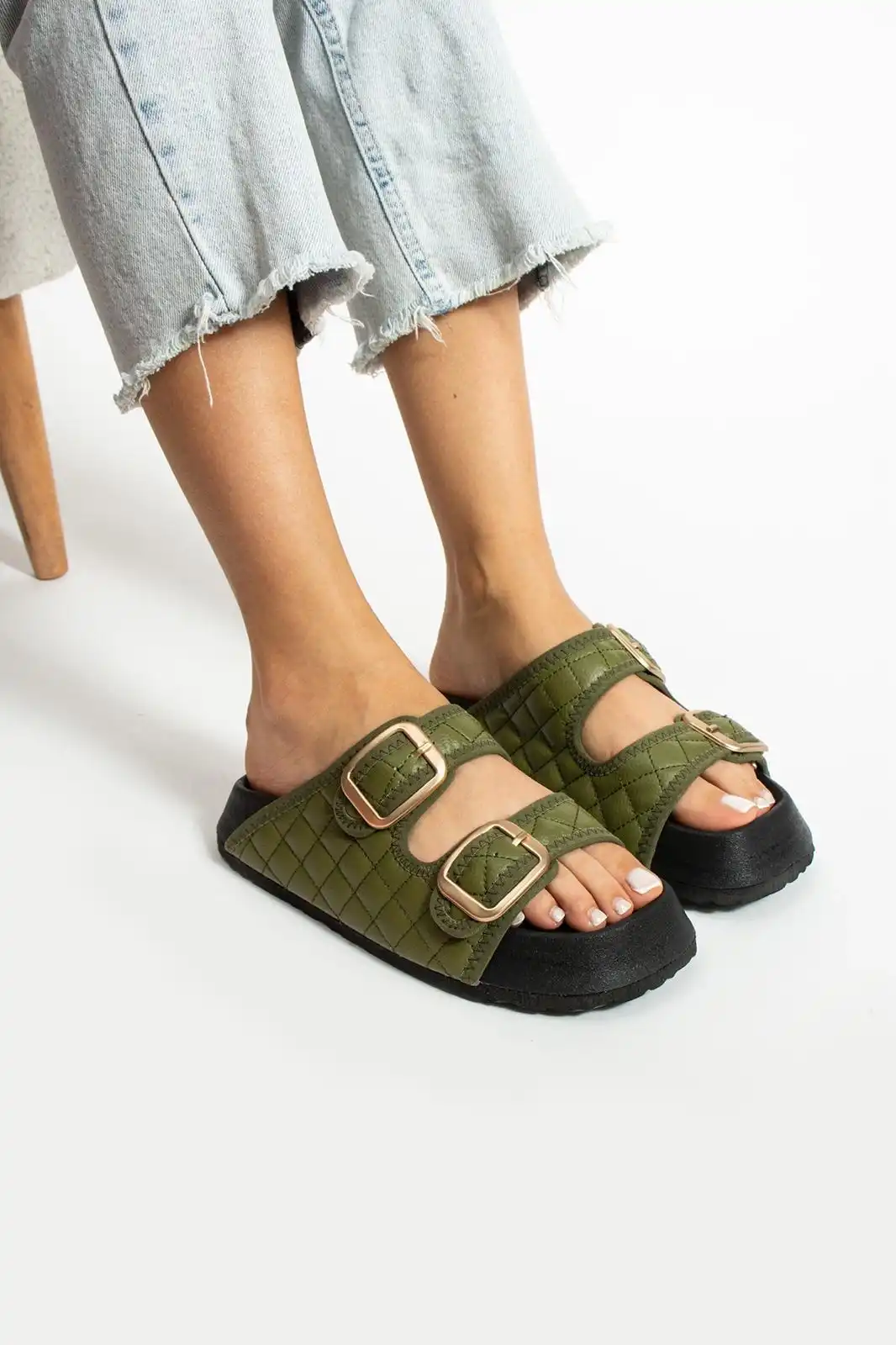 Şıklık ve konforu bir arada sunan Kapitone Tokalı Kadın Terlik Haki, günlük kullanım için ideal bir terlik seçeneğidir.