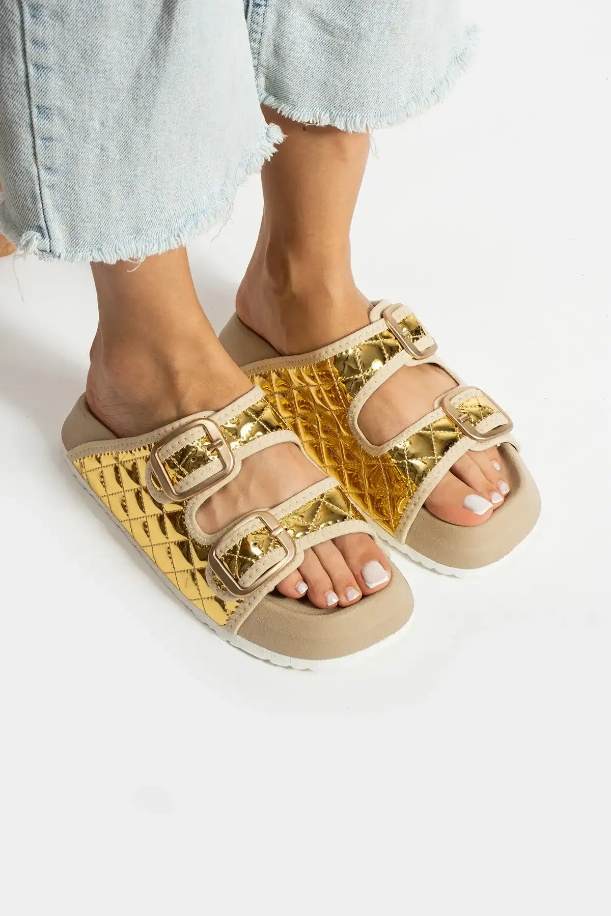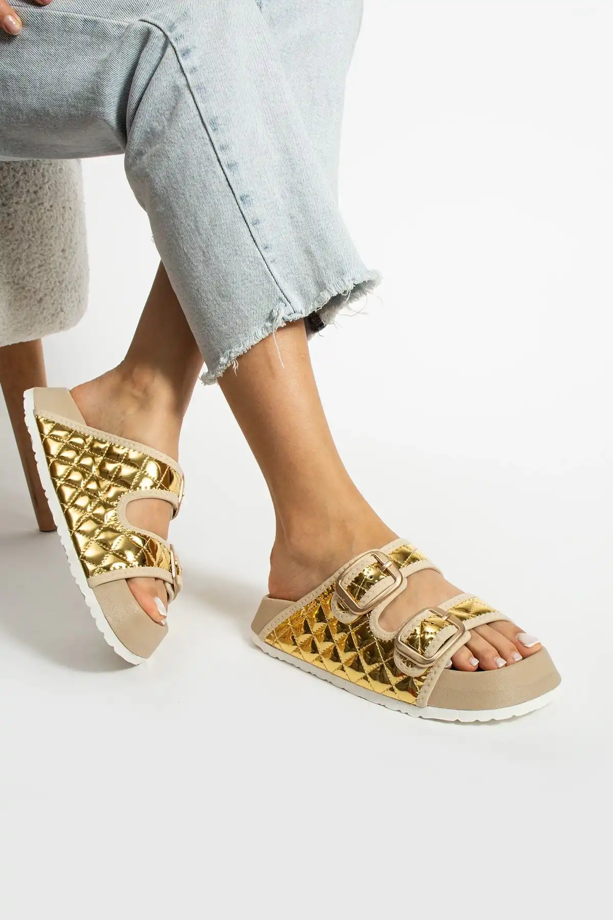 Altın Kapitone Tokalı Parlak Kadın Terlik ile şıklığı ve konforu bir arada yaşayarak günlük hayatta rahat edebilirsiniz.