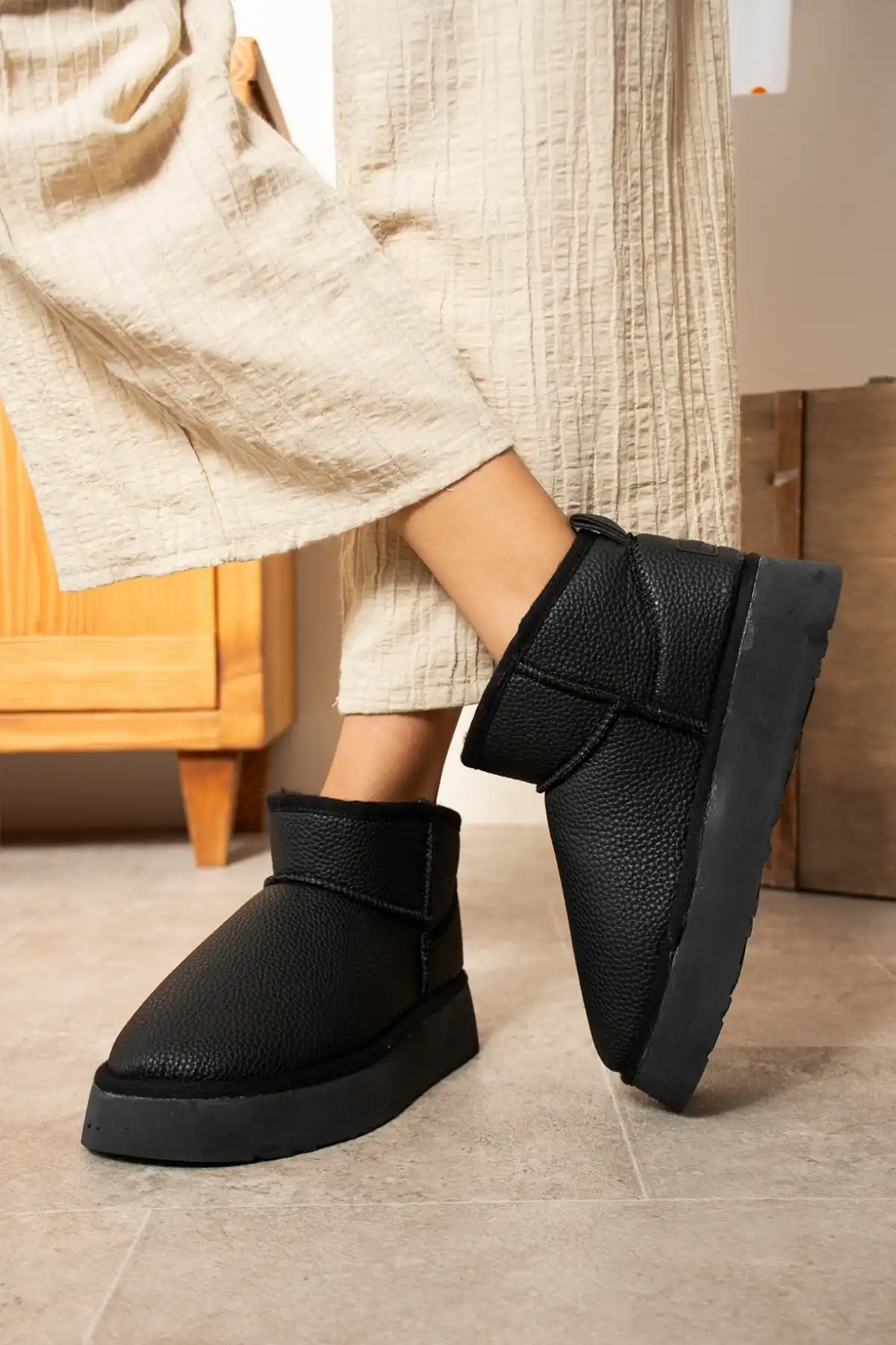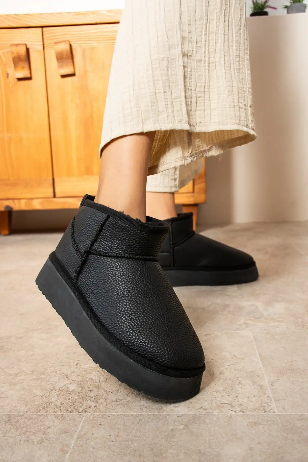 Mini Bot Classic Deri Tüylü Bot, şıklığı ve rahatlığı bir araya getiren bir seçenektir. Siyah rengi ile her stil ile kolayca kombinlenir.